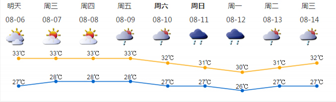 根據(jù)天氣預(yù)報,未來一周天氣以晴天為主,9號 -14號將有降雨,但氣溫依然是維持在30°C以上,最高氣溫達(dá)到33°C。