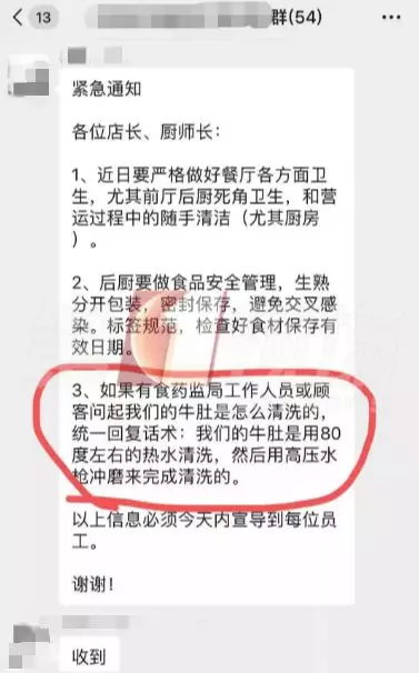 這張聊天截圖顯示:前晚7點54分,八合里的一個內(nèi)部群,發(fā)出了一則緊急通知,要求店長、廚師長近期要做好餐廳各方面衛(wèi)生,后廚要做好食品安全管理。如果有食藥監(jiān)局工作人員或顧客詢問,牛肚是怎么清洗的,統(tǒng)一回復的話術是:我們的牛肚是用80度左右的熱水清洗,然后用高壓水槍沖磨來完成清洗的。