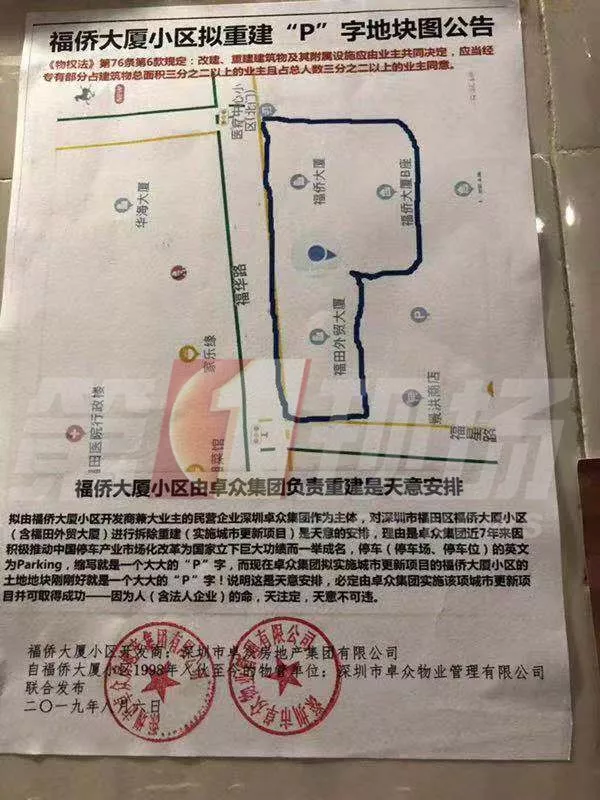 在福僑大廈小區(qū)公告欄里,出現(xiàn)了一張小區(qū)擬重建“p”字地塊圖的公告,落款為深圳市卓眾房地產(chǎn)集團有限公司,擬重建的地塊包括福僑大廈A、B座和福田外貿(mào)大廈,文中寫道,福僑大廈由卓眾房地產(chǎn)集團負責(zé)重建是天意安排。
