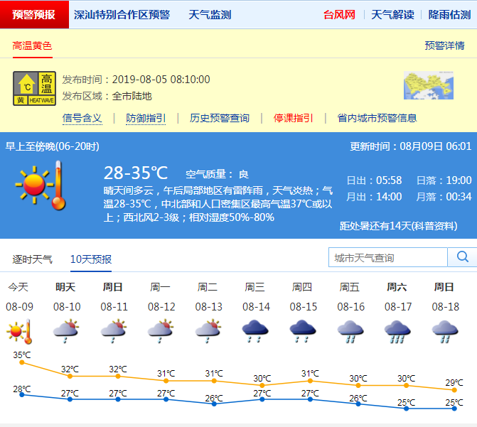 預(yù)計9日高溫天氣持續(xù),最高氣溫34-36℃,局地37℃或以上;10-11日多云有陣雨或雷陣雨;12-15日,陰天間多云有陣雨或雷陣雨,部分時間雨勢大。