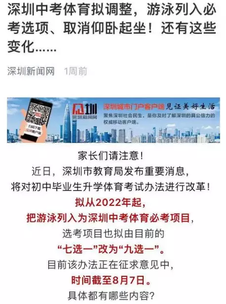 調(diào)整后,深圳體育中考分?jǐn)?shù)由統(tǒng)一現(xiàn)場(chǎng)考試成績(jī)分值32分、過(guò)程性考核(平時(shí)成績(jī))分值12分和《國(guó)家學(xué)生體質(zhì)健康標(biāo)準(zhǔn)》測(cè)試分值6分組成,滿分為50分。其中,體育考試考試項(xiàng)目仍為“1+1”,即考生參加1項(xiàng)必考科目和1項(xiàng)選考項(xiàng)目。必考科目由現(xiàn)在的200米跑和中長(zhǎng)跑(800米[女]和1000米[男])任選其一調(diào)整為中長(zhǎng)跑(800米[女]和1000米[男])或100米游泳任選其一。