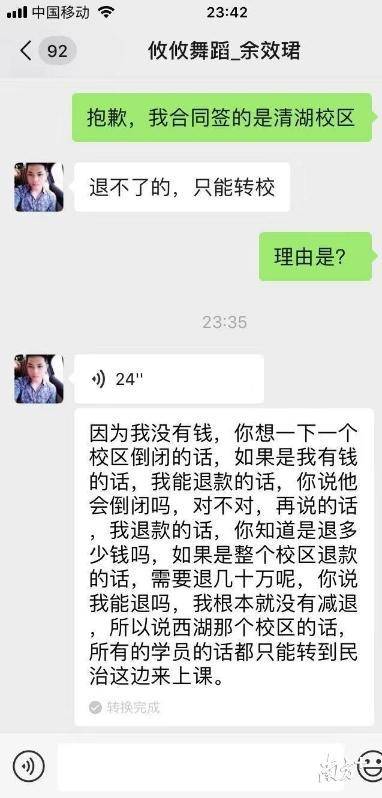 目前,學員們無法與余效珺保持穩(wěn)定聯(lián)系,但是8月7日與學員的溝通中,余效珺承認清湖校區(qū)需退的學費約有幾十萬,他無力退還,只能建議學員轉到民治校區(qū)上課。