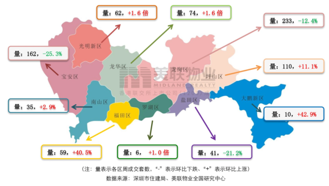 各區(qū)具體成交量及環(huán)比增減幅度差異明顯。其中龍崗成交233套,雖環(huán)比下降12.4%,但總量仍居全市首位;寶安成交162套,位居全市第二位,成交量環(huán)比下降25.3%。此外,龍華和光明并列成為上周一手住宅成交量環(huán)比上升幅度最大的區(qū)域,均增長1.6倍,分別增至74和62套。而羅湖區(qū)盡管成交套數(shù)也大幅增長達1倍,但是羅湖區(qū)新房較少,即使增長一倍也僅有6套成交。