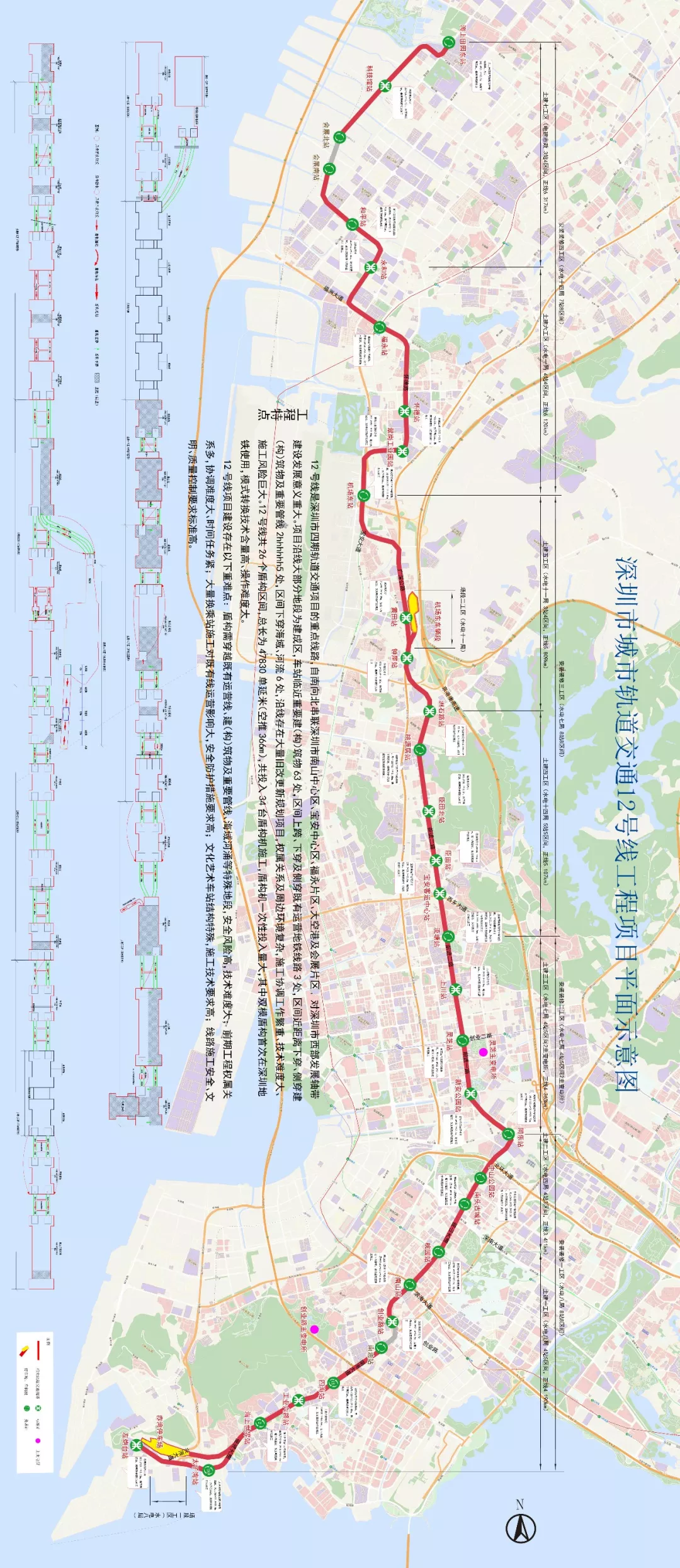 地鐵12號(hào)線起自南山區(qū)左炮臺(tái)站自南向北穿越南山中心區(qū)、寶安中心區(qū)、福永、大空港等片區(qū)后終至寶安區(qū)海上田園東站,線路全長(zhǎng)40.56km,是進(jìn)一步支撐深圳西部發(fā)展,提升前海蛇口自貿(mào)區(qū),空港新城發(fā)展品質(zhì)的交通骨干線。