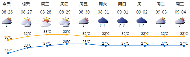 我市大雨轉(zhuǎn)陣雨;氣溫23-30℃;西南風3級;相對濕度65%-95%。