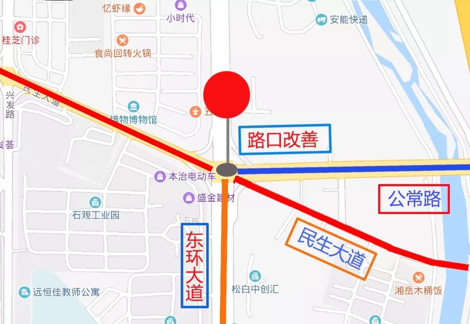 ▼改造前:東環(huán)大道、公常路皆為光明區(qū)主干道,車流量大,但車道狹窄,路口擁堵,存在極大的安全隱患。此外,該路口人車混行,非機動車逆行現(xiàn)象嚴(yán)重,中間岔口僅用石墩圍擋,安全隱患突出。