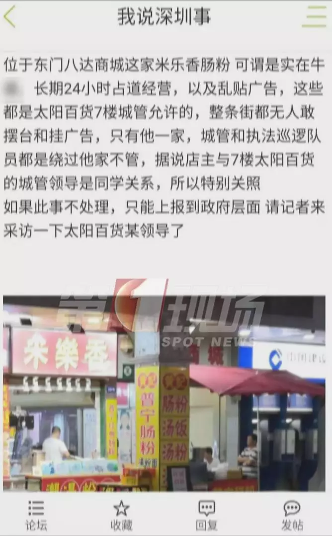 昨天,論壇上的一則帖子引起網(wǎng)友圍觀,帖子提到位于東門八達商城的米樂腸粉店,24小時占道經(jīng)營,亂貼廣告。整條街都不敢這么做,唯獨這家沒有城管管理,原因是店主跟7樓太陽百貨的城管領(lǐng)導(dǎo)是同學(xué)。