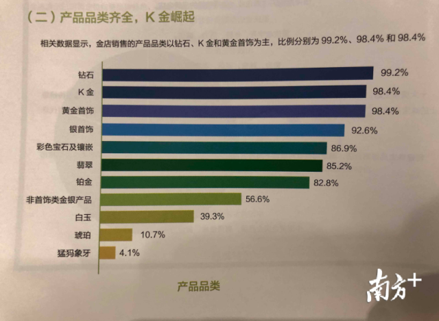 從消費(fèi)品類而言,黃金購買量最大,占比64.3%;K金材質(zhì)產(chǎn)品,占比29.7%;第三是鉑金,占比28.1%;第四是鉆石及鉆石鑲嵌類、白銀制品,占比分別是19.4%和18.3%;彩寶及玉石鑲嵌類的消費(fèi)占比為16.3%;珍珠及包裹金制品約為10%和7.9%。而且,戒指與相連需求最高。