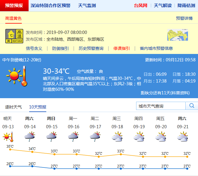 見圳客戶端·深圳新聞網(wǎng)2019年9月12日訊 深圳氣象局預(yù)計12日晴天間多云,天氣炎熱,局部有短時雷陣雨;氣溫28-34℃,中北部或人口密集區(qū)最高氣溫35℃以上;東風2-3級;相對濕度60%-90%。13日晴到多云,局部有短時雷雨;14-17日多云,有雷陣雨,高溫天氣逐漸緩解。