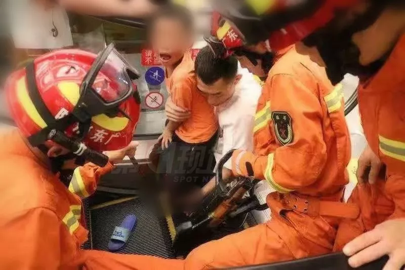到達現(xiàn)場后,消防人員發(fā)現(xiàn),小孩前腳掌已卡進手扶電梯內(nèi),都嚇得大哭。經(jīng)過消防人員奮力營救,成功救出被卡小孩,交給120救護人員送往醫(yī)院。