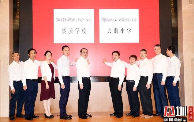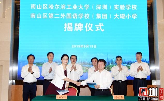 活動(dòng)中,南山區(qū)哈爾濱工業(yè)大學(xué)(深圳)實(shí)驗(yàn)學(xué)校及南山區(qū)第二外國(guó)語學(xué)校(集團(tuán))大磡小學(xué)兩所學(xué)校正式揭牌。南山區(qū)委書記王強(qiáng),哈工大(深圳)黨委書記吳德林,南山區(qū)委副書記、代區(qū)長(zhǎng)黃湘岳,深圳大學(xué)城管理辦公室副主任戴興毅、哈工大(深圳)副校長(zhǎng)姚英學(xué)、南山區(qū)副區(qū)長(zhǎng)練聰、哈工大(深圳)工會(huì)負(fù)責(zé)人張敏等出席簽約儀式,并為兩所新校揭牌。南山區(qū)政協(xié)副主席、區(qū)教育局局長(zhǎng)劉根平主持儀式。