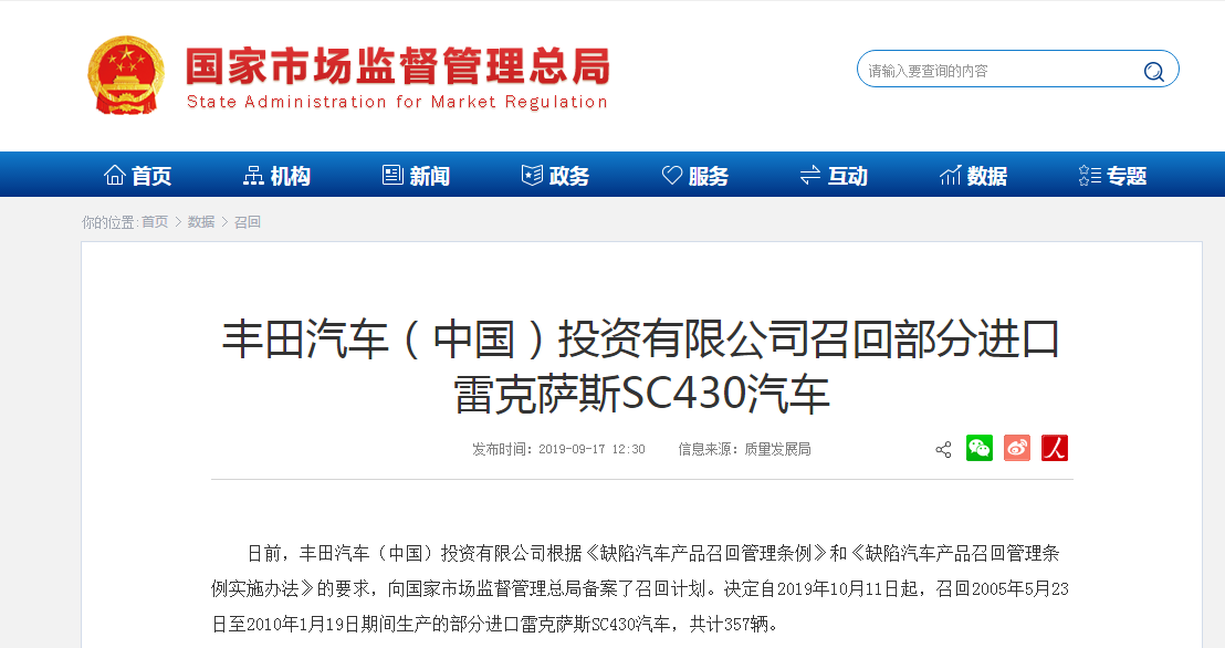 日前,豐田汽車(中國)投資有限公司根據(jù)《缺陷汽車產(chǎn)品召回管理條例》和《缺陷汽車產(chǎn)品召回管理條例實施辦法》的要求,向國家市場監(jiān)督管理總局備案了召回計劃。決定自2019年10月11日起,召回2005年5月23日至2010年1月19日期間生產(chǎn)的部分進(jìn)口雷克薩斯SC430汽車,共計357輛。
