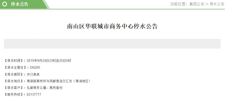 見圳客戶端?深圳新聞網(wǎng)2019年9月22日訊 近日,深圳水務(wù)集團官網(wǎng)陸續(xù)發(fā)布停水公告。深圳新聞網(wǎng)記者了解到,9月23-24日,福田、南山、羅湖等區(qū)的多個小區(qū)和企業(yè)單位將受影響,請市民提前做好儲水準備。