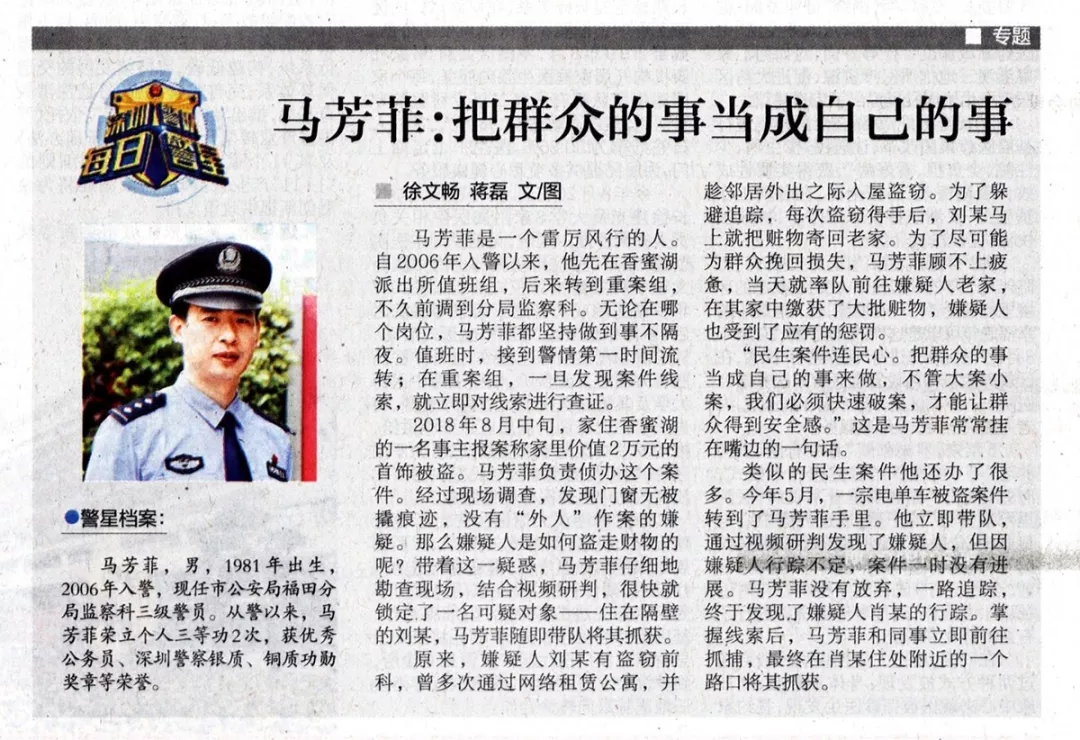 “民生案件連民心。把群眾的事當成自己的事來做,不管大案小案,我們必須快速破案,才能讓群眾得到安全感。”這是馬芳菲常常掛在嘴邊的一句話。