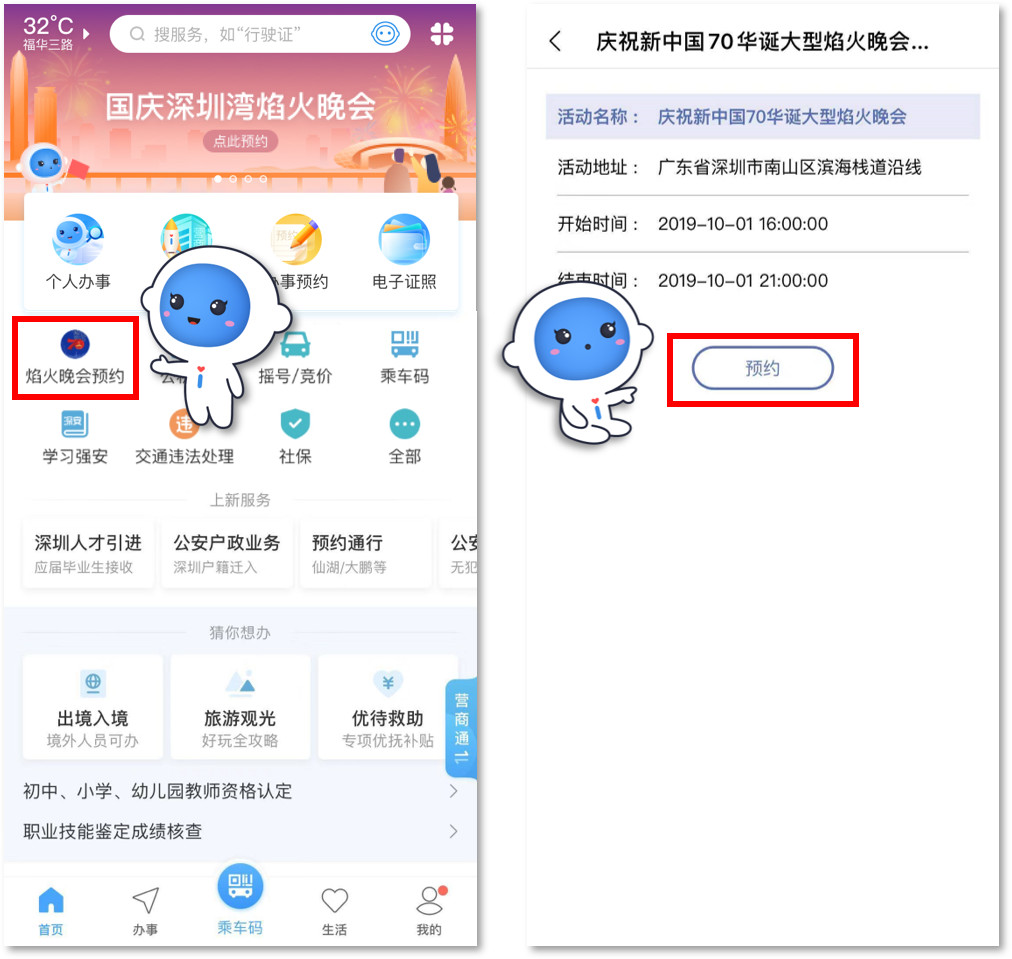 2.點(diǎn)擊首頁頂部圖片或焰火晚會(huì)預(yù)約入口進(jìn)入預(yù)約頁面,點(diǎn)擊預(yù)約: