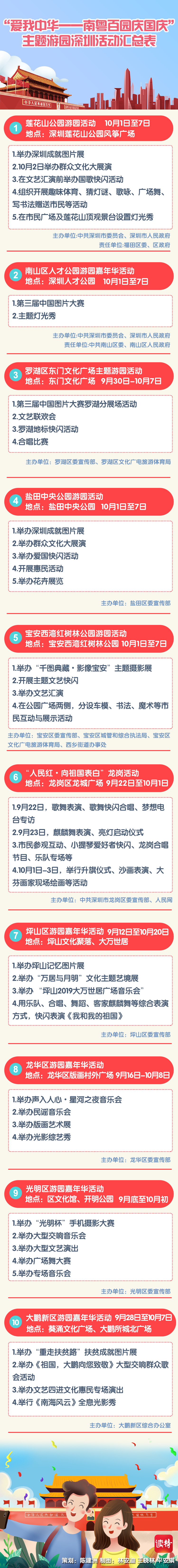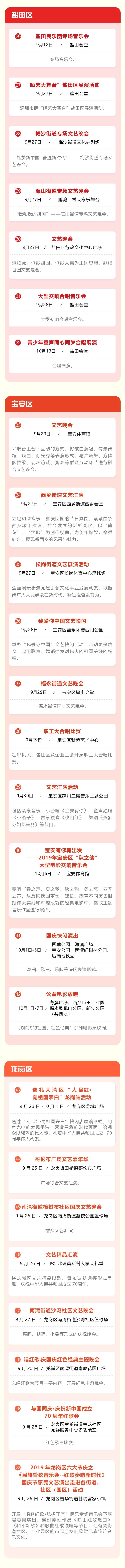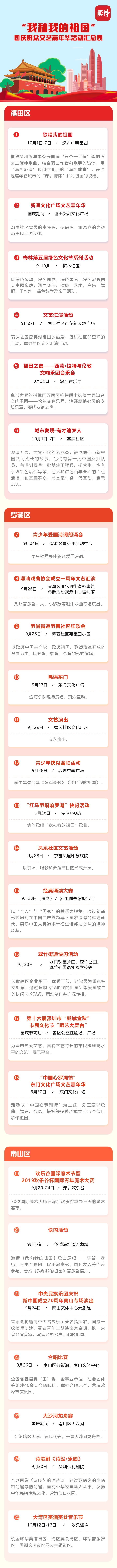 深圳特區(qū)報2019年9月26日訊 為熱烈慶祝中華人民共和國成立70周年,深圳市將舉辦規(guī)模盛大的全市性專場音樂會、群眾文藝晚會、焰火晚會等活動,同時將在各區(qū)舉辦80場“我和我的祖國”國慶群眾文藝嘉年華活動,并在全市各區(qū)舉行“愛我中華——南粵百園慶國慶”主題游園。各有關活動安排如下: