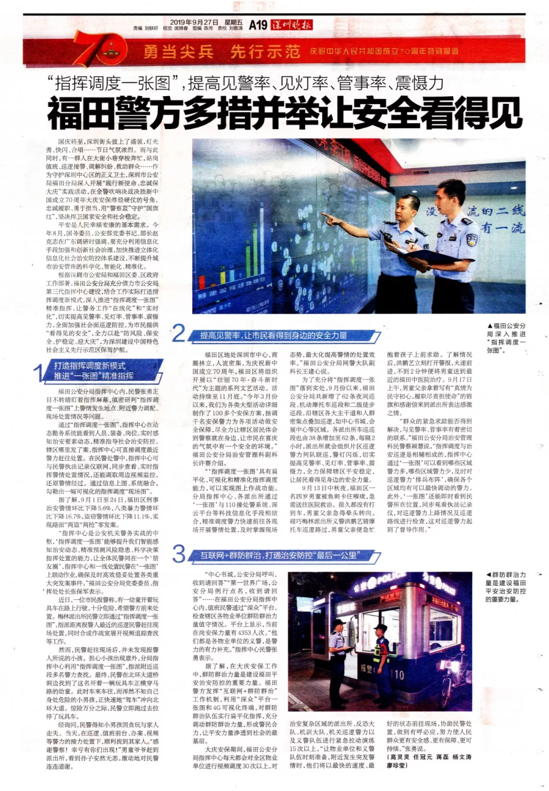 國慶將至,深圳街頭披上了盛裝,燈光秀、快閃、合唱……處處喜氣洋洋,節(jié)日氣氛濃烈。在這鮮艷亮麗的平安底色下,有一群人在大街小巷穿梭奔忙,站崗值班、巡邏接警、調(diào)解糾紛、救助群眾……作為守護(hù)深圳中心區(qū)的正義衛(wèi)士,深圳市公安局福田分局深入開展“踐行新使命、忠誠保大慶”實(shí)踐活動(dòng),在全警吹響決戰(zhàn)決勝新中國成立70周年大慶安保維穩(wěn)硬仗的號角,忠誠履職、勇于擔(dān)當(dāng),用“警察藍(lán)”守護(hù)“國旗紅”,努力營造平安祥和歡樂的節(jié)日氛圍,堅(jiān)決捍衛(wèi)國家安全和社會(huì)穩(wěn)定。