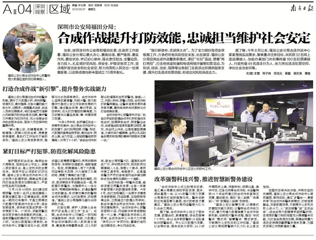 合成作戰(zhàn)中心民警李書懷說:“自己所在的數(shù)據(jù)合成中隊積極推動本地合成、拓展異地合成、探索警企合成,線索推送和信息核查更加規(guī)范、高效,突出網(wǎng)上作戰(zhàn),讓落地管控更精準、辦案效率大幅提高,全員現(xiàn)在以扎實的備戰(zhàn)要求和飽滿的精神風貌服務支撐一線?!?/p> (二)緊盯目標嚴打犯罪,防范化解風險隱患 維護國家政治安全、確保社會大局穩(wěn)定、促進社會公平正義、保障人民安居樂業(yè),是公安機關(guān)的主要任務。保民平安必須緊盯打防犯罪,福田公安分局合成作戰(zhàn)中心充分利用大數(shù)據(jù)手段,提高運用互聯(lián)網(wǎng)打擊各類違法犯罪的能力,嚴密防范各類風險隱患。