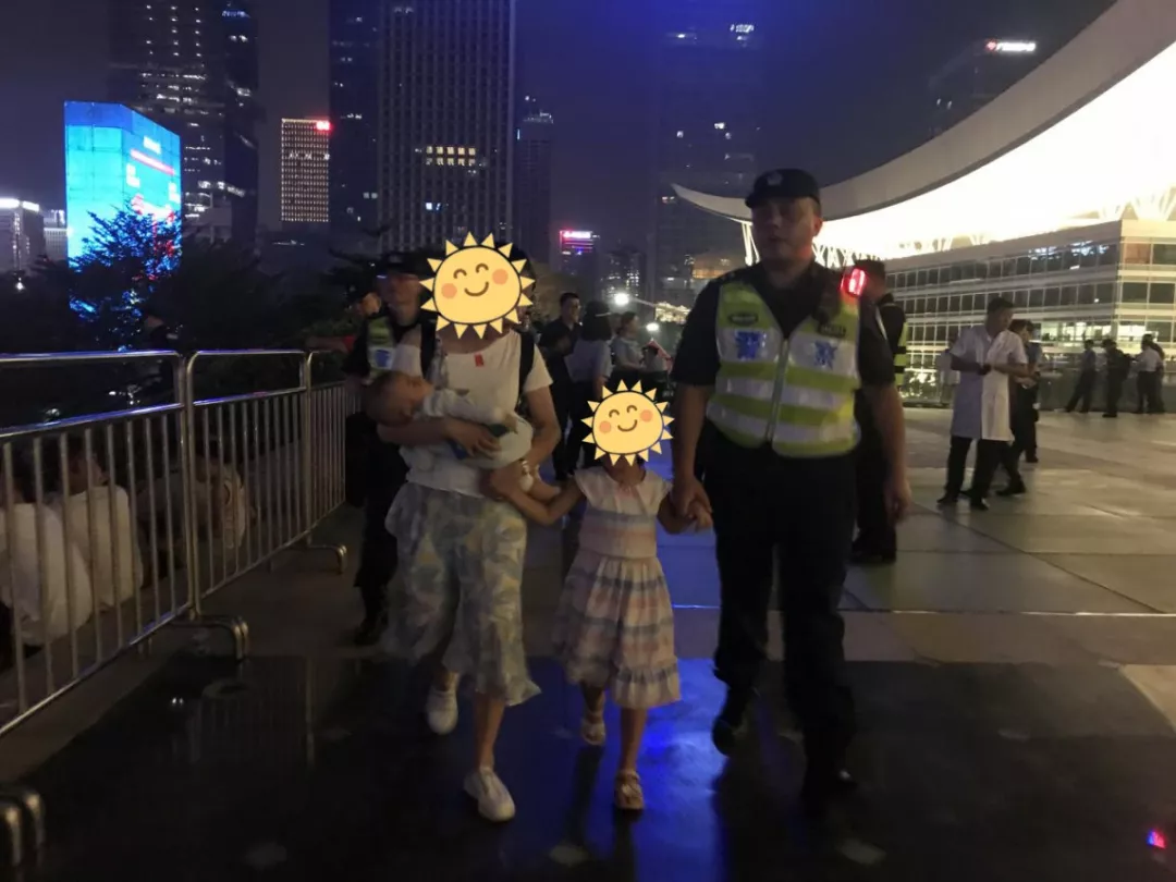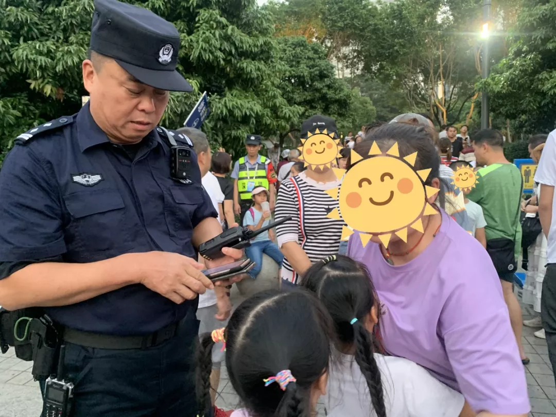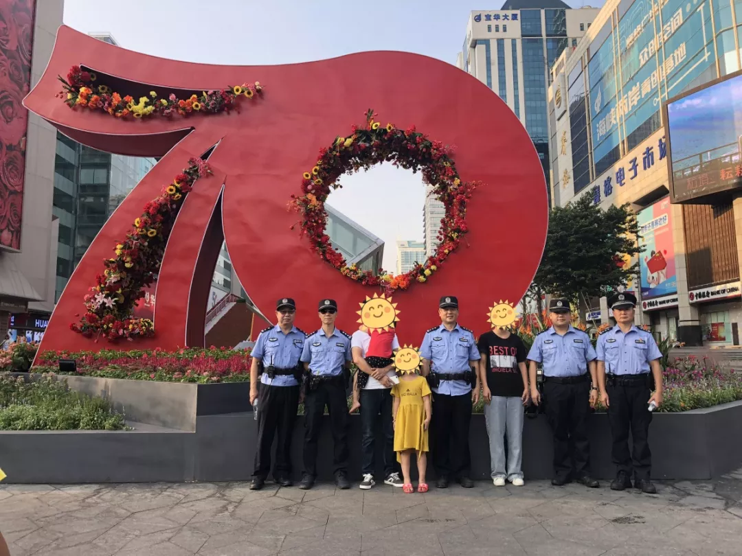 10月2日深圳市公安局福田分局華富派出所民警在燈光秀外圍執(zhí)勤過程中發(fā)現(xiàn)走失小孩,并幫助其找到父親和舅舅。