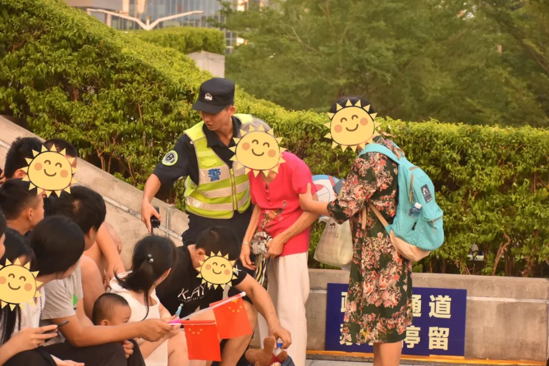 10月2日燈光秀現(xiàn)場,深圳市公安局福田公安分局機動訓練大隊摩托車中隊隊員幫助年邁的老奶奶尋找合適的觀燈位置。