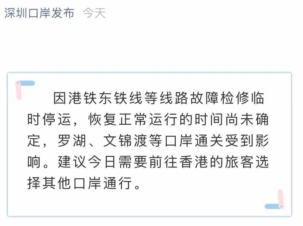 昨天上午11點,深圳市口岸辦官方微信號“深圳口岸發(fā)布”發(fā)布消息:因港鐵東鐵線等線路故障檢修臨時停運,恢復(fù)正常運行的時間尚未確定,羅湖、文錦渡等口岸通關(guān)受到影響。建議今日需要前往香港的旅客選擇其他口岸通行。