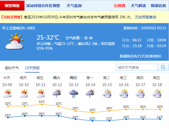 見圳客戶端·深圳新聞網(wǎng)2019年10月9日訊 據(jù)深圳市氣象局消息,9日,深圳多云間晴;氣溫25-32℃;偏東風(fēng)2-3級;相對濕度65%-95%。