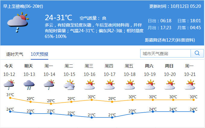 見(jiàn)圳客戶端·深圳新聞網(wǎng)2019年10月12日訊 據(jù)深圳市氣象臺(tái)消息,今日深圳多云,有輕微至輕度灰霾,午后至夜間轉(zhuǎn)陣雨,并伴有短時(shí)雷暴;氣溫24-31℃;偏東風(fēng)2-3級(jí);相對(duì)濕度65%-100%