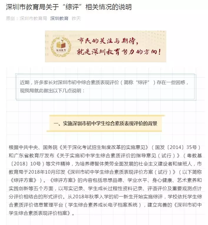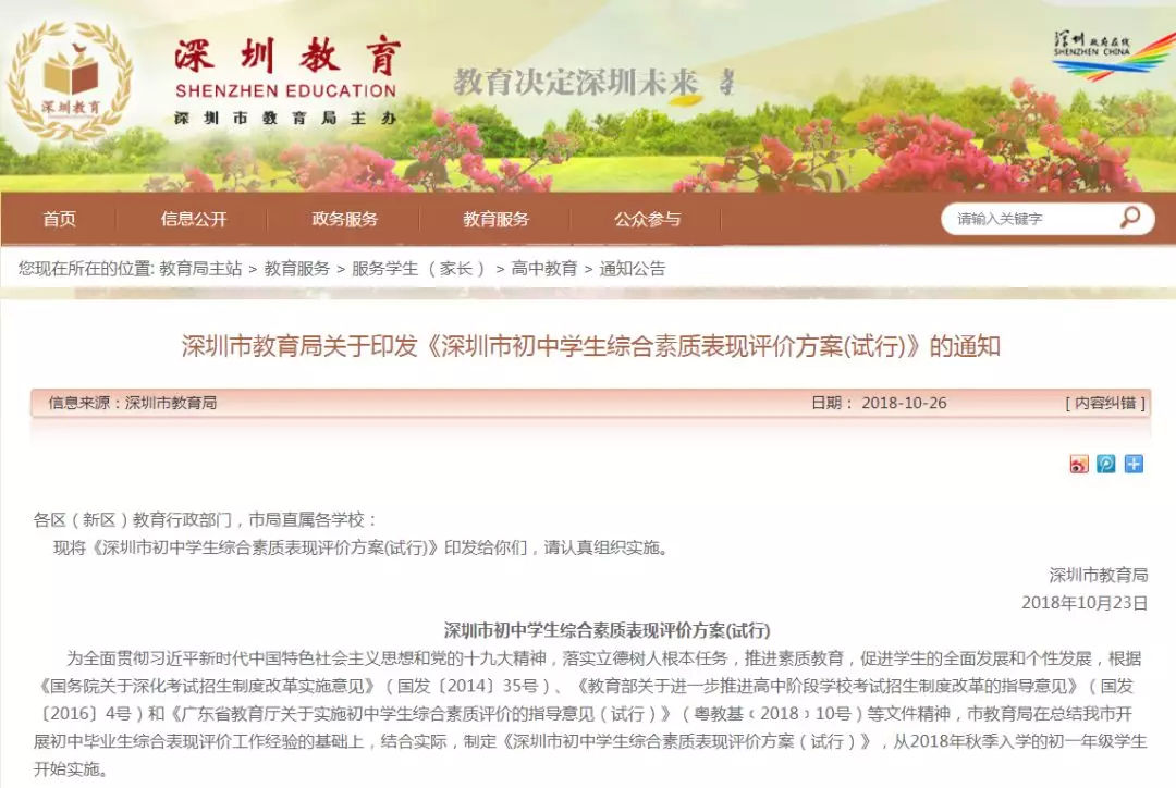 《深圳市初中學(xué)生綜合素質(zhì)表現(xiàn)評(píng)價(jià)方案(試行)》(以下簡(jiǎn)稱(chēng)《綜評(píng)方案》)于2018年10月印發(fā)。