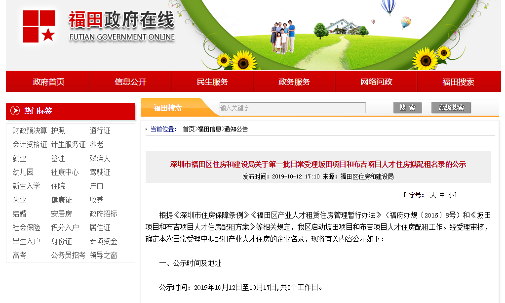 晶報(bào)2019年10月15日訊 記者從福田政府在線官網(wǎng)了解到,福田區(qū)第一批日常受理坂田項(xiàng)目和布吉項(xiàng)目人才住房擬配租名錄公示啦!共72家公司進(jìn)入名錄。此外,福田區(qū)還有1600套住房15日起開始配租,房源選完即止!