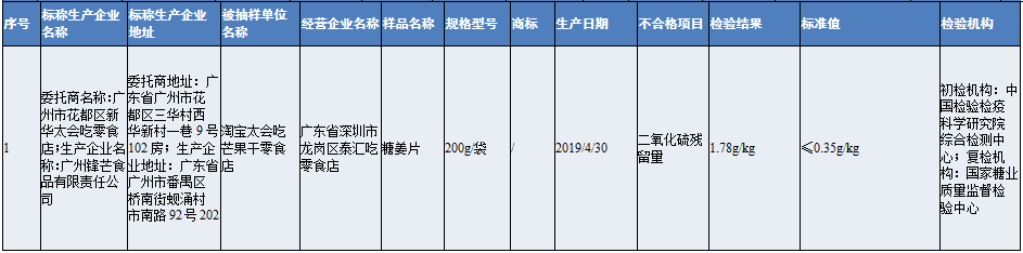 其中,深圳市龍崗區(qū)泰匯吃零食店經(jīng)營的淘寶店銷售的糖姜片,被檢出二氧化硫殘留量不符合食品安全國家標準規(guī)定,存在食品添加劑超限量使用的問題。