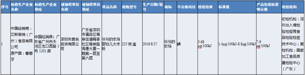 深圳市君尚百貨有限公司銷售的爺爺?shù)霓r(nóng)場嬰幼兒大米粉(原產(chǎn)國:葡萄牙),其中碘檢出值低于產(chǎn)品包裝標簽明示值的80%,營養(yǎng)指標不達標。