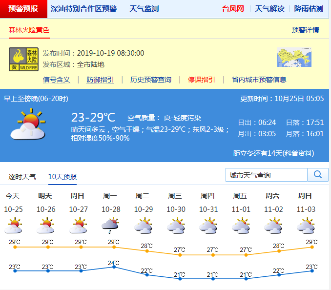 見圳客戶端·深圳新聞網(wǎng)2019年10月25日訊 深圳市氣象局預(yù)計(jì),25-27日晴天間多云,25日氣溫23-29℃;28-29日云量增多,部分時(shí)間有分散小雨;30-31日晴天間多云。