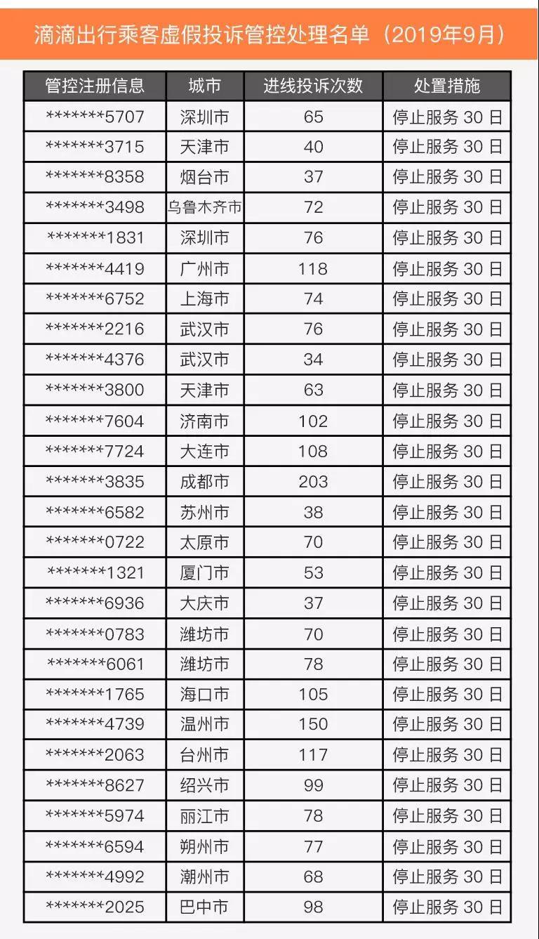 晶報2019年10月25日訊 昨日(24日),滴滴出行微信公眾號公示2019年9月部分虛假投訴的乘客以及存在惡意行為的駕駛員名單,名單中包括27名乘客和50名司機。