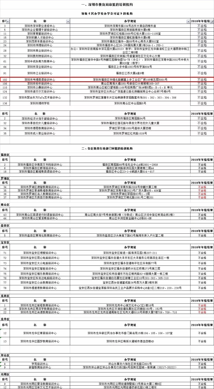 10月25日,深圳市教育局發(fā)布了《深圳市教育培訓(xùn)機(jī)構(gòu)年審信息公告》,為市民選擇培訓(xùn)機(jī)構(gòu)提供參考,其中有48家培訓(xùn)機(jī)構(gòu)2018年年檢結(jié)果被評(píng)定為不合格,其中韋博英語(yǔ)的名字赫然在列。