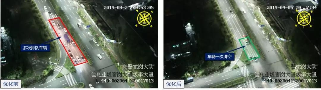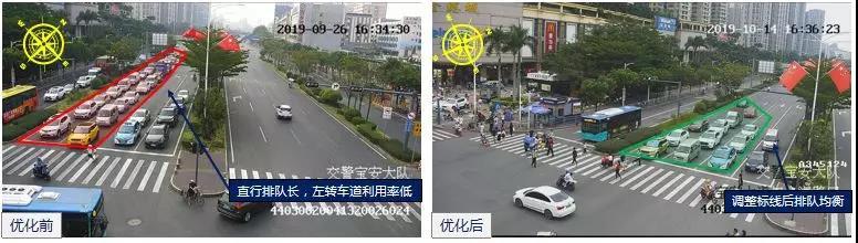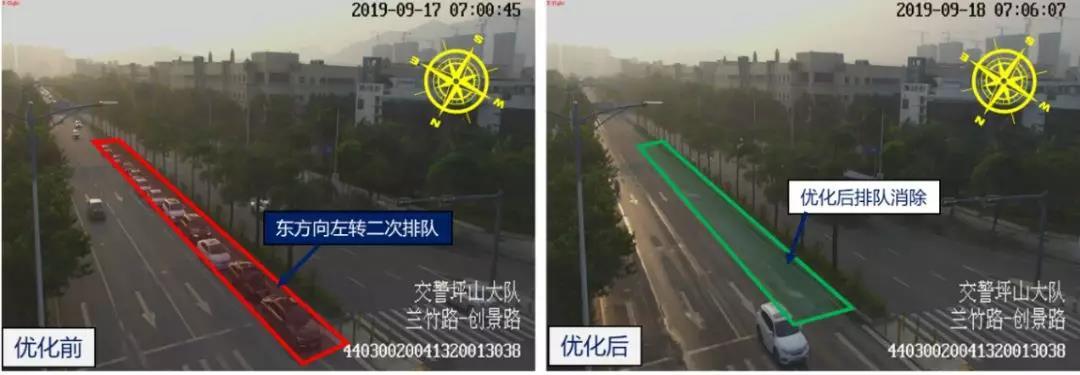 針對這一問題,深圳交警根據(jù)路口各時(shí)段、各方向的通勤需求,調(diào)整優(yōu)化了路口紅綠燈配時(shí)方案,適當(dāng)增加了擁堵方向時(shí)間。優(yōu)化后,路口晚高峰西往東方向車輛排隊(duì)由300多米降至60米左右,下降80%,車輛基本實(shí)現(xiàn)1次通行。