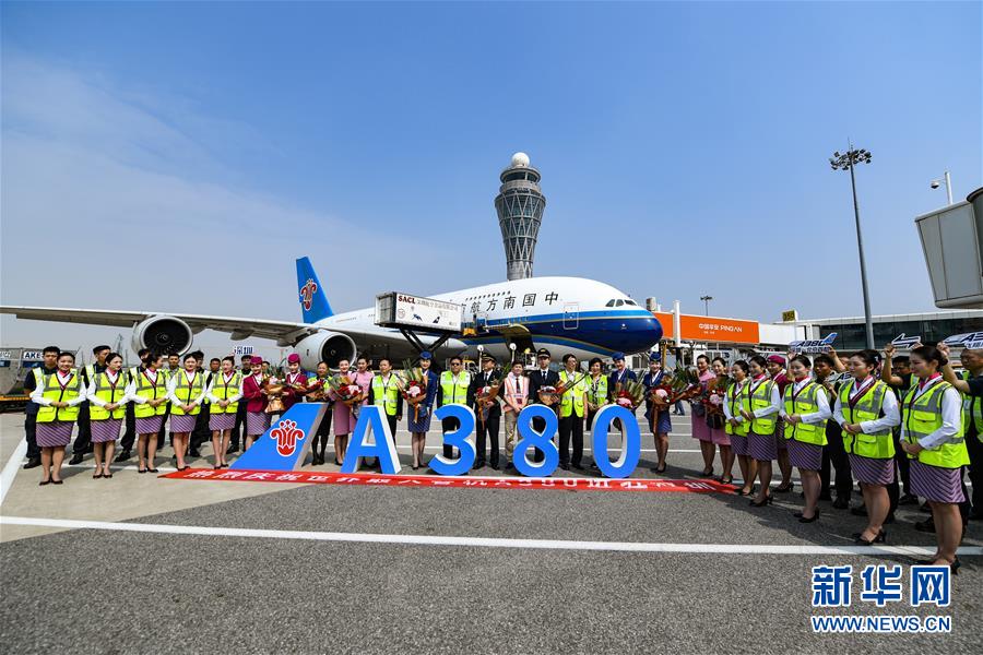 10月27日,機(jī)組、地勤人員等慶??罩锌蛙嘇380客機(jī)重返深圳機(jī)場。當(dāng)日下午,由全球最大寬體客機(jī)——空中客車A380執(zhí)飛的南航CZ3153次航班由深圳起飛前往北京,標(biāo)志著這款“空中巨無霸”機(jī)型重返深圳機(jī)場。南航曾在2014年5月開始啟用A380執(zhí)飛京深航線,后因動(dòng)態(tài)運(yùn)力調(diào)配停飛。新華社記者毛思倩攝