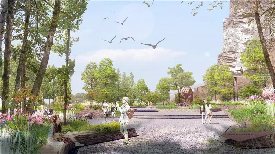 拼搏巖嶺的設(shè)計試圖恢復(fù)場地記憶,以石材結(jié)合銹板的形式塑造場地表達(dá)堅韌精神,同時保留現(xiàn)狀的巖生植物表達(dá)頑強拼搏的生命力。