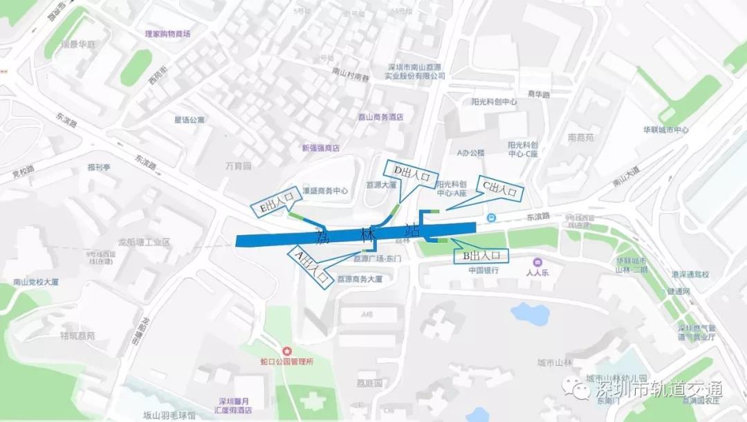 其中,A出入口位于荔園商務大廈北側,B出入口位于城市山林廣場北側,C出入口位于陽光科創(chuàng)南側,D出入口位于荔源大廈東側,E出入口位于濠盛商務中心南側。