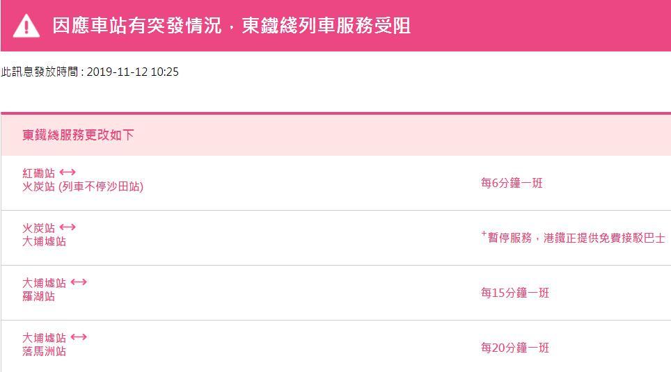 據(jù)港鐵官網(wǎng)目前最新消息,東鐵線列車(chē)運(yùn)營(yíng)服務(wù)調(diào)整為:紅磡站至火炭站每6分鐘一班;火炭站至大埔墟站暫停服務(wù);大埔墟站至羅湖站每15分鐘一班;大埔墟站至落馬洲站每20分種一班。港鐵其他線路也有多處調(diào)整。