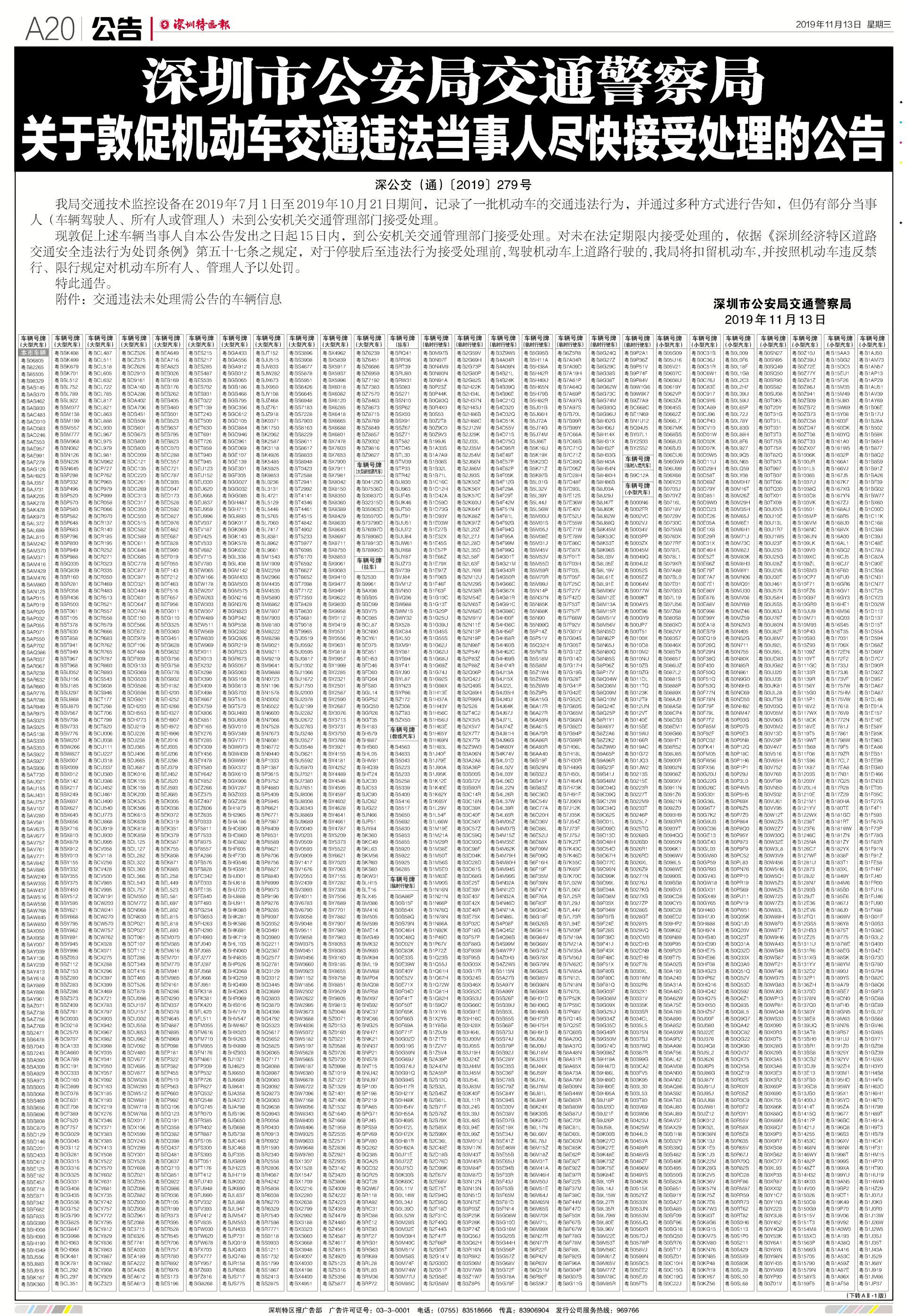 今年7月至10月初,全市機動車被“電子警察”抓拍交通違法行為1342781宗,深圳交警通過多種方式進行交通違法行為告知,但截止至目前仍有部分機動車的非現(xiàn)場交通違法未及時處理。