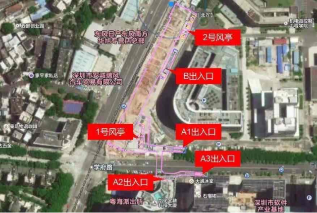 深大南站位于學(xué)府路與白石路交界處北側(cè),車站出入口共計4個:A1出入口、A2出入口、A3出入口、B出入口,其中A1出入口位于深圳大學(xué)基礎(chǔ)實驗樓一期南側(cè),B出入口位于深圳大學(xué)基礎(chǔ)實驗樓一期西側(cè)