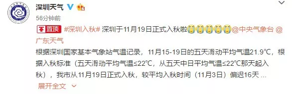 根據(jù)深圳國(guó)家基本氣象站氣溫記錄,11月15-19日的五天滑動(dòng)平均氣溫21.9℃,根據(jù)入秋標(biāo)準(zhǔn)(五天滑動(dòng)平均氣溫≤22℃,從五天中日平均氣溫≤22℃那天起入秋),我市從11月19日正式入秋,較平均入秋時(shí)間(11月3日)偏遲16天。