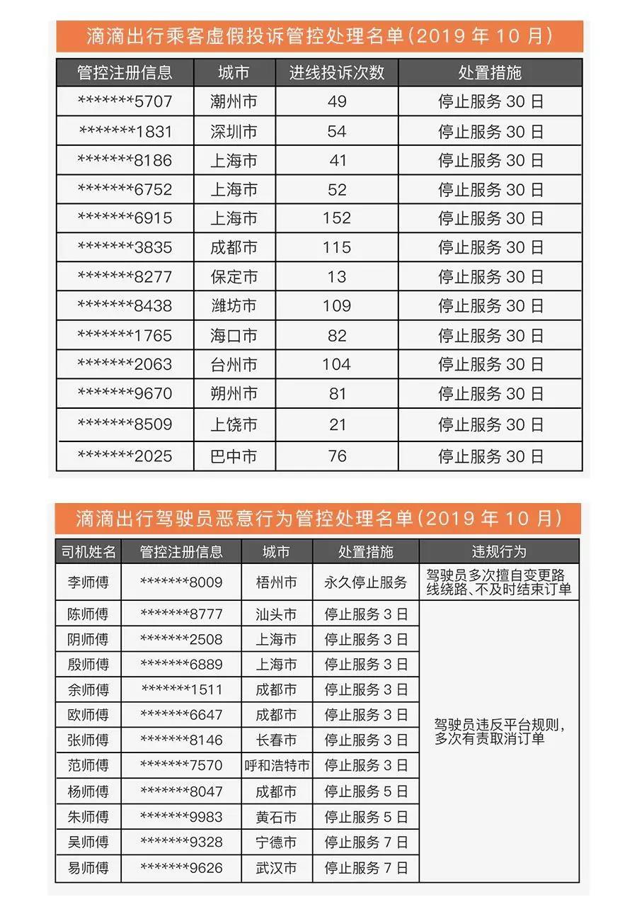 晶報2019年11月20日訊 11月20日,滴滴出行通過官方微信公眾號對10月違規(guī)司、乘“黑名單”進(jìn)行了公示。乘客黑名單中,惡意投訴次數(shù)最多的高達(dá)152次;司機(jī)黑名單中一位梧州市的李師傅因多次擅自變更路線繞路、不及時結(jié)束訂單等違規(guī)行為被永久停止服務(wù)。
