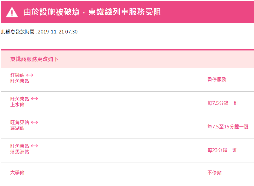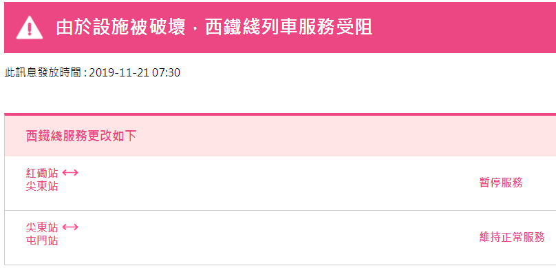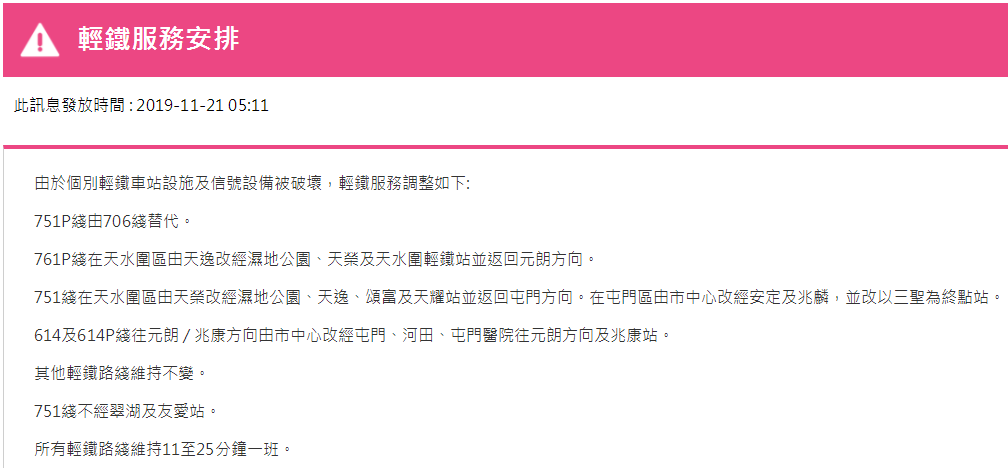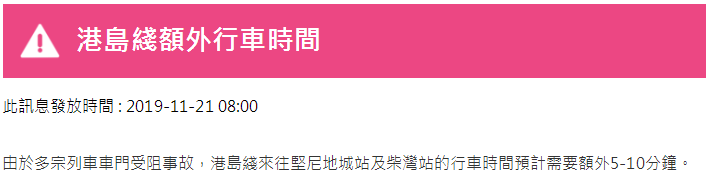 據(jù)港鐵消息,11月21日,香港地鐵各線(機(jī)場快線除外)、輕鐵及港鐵巴士的服務(wù)將于晚上11時(shí)結(jié)束。西鐵線/東鐵線紅磡站及大學(xué)站繼續(xù)關(guān)閉。需要注意的是,元朗站將于下午2時(shí)關(guān)閉,列車不停元朗站,此外,個別車站出入口會暫時(shí)關(guān)閉。