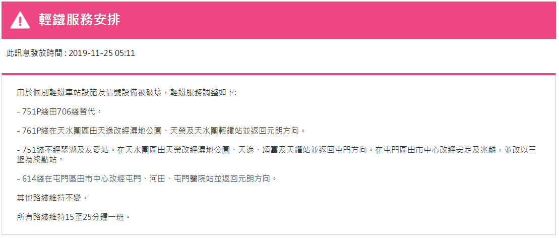 據(jù)港鐵消息,11月25日,香港地鐵各線(機(jī)場(chǎng)快線除外)、輕鐵及港鐵巴士的服務(wù)將于晚上11時(shí)結(jié)束。紅磡站恢復(fù)列車(chē)服務(wù),但只開(kāi)放B、C出入口。大學(xué)站繼續(xù)關(guān)閉,列車(chē)不停大學(xué)站,個(gè)別車(chē)站出入口也會(huì)暫時(shí)關(guān)閉。