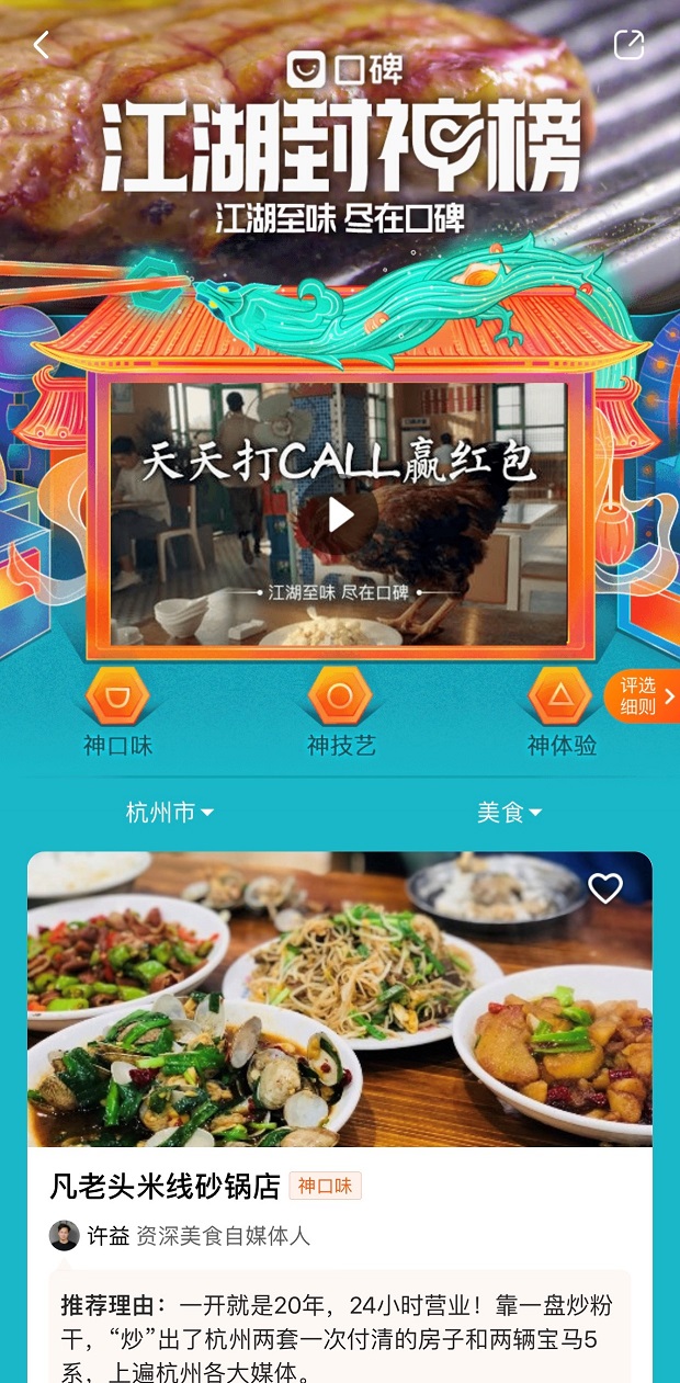 今年“雙12”,口碑餓了么首次發(fā)布“江湖封神榜”,入圍店鋪先由美食體驗者、觀察家、媒體團(tuán)在內(nèi)的本地評審團(tuán)先提名,再經(jīng)過阿里本地生活大數(shù)據(jù)進(jìn)行智能評分,同時邀請眾多消費者投票驗名“真身“。商戶上榜不靠流量,不用刷單,也不必?fù)?dān)心惡意差評影響流量和排名。消費者就算沒有本地老餮帶路,參考“江湖封神榜”就能找到地道美食。目前,首批入選的1730家店鋪,分布在北京、杭州、成都、廣州等13座城市。消費者通過口碑a(chǎn)pp上選擇相應(yīng)的城市坐標(biāo),點擊“江湖封神榜”,就可以找到推薦好店。