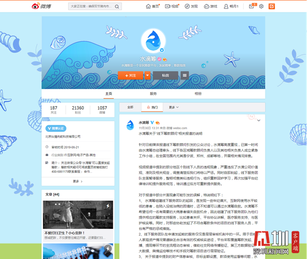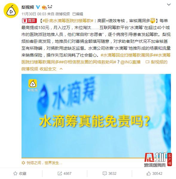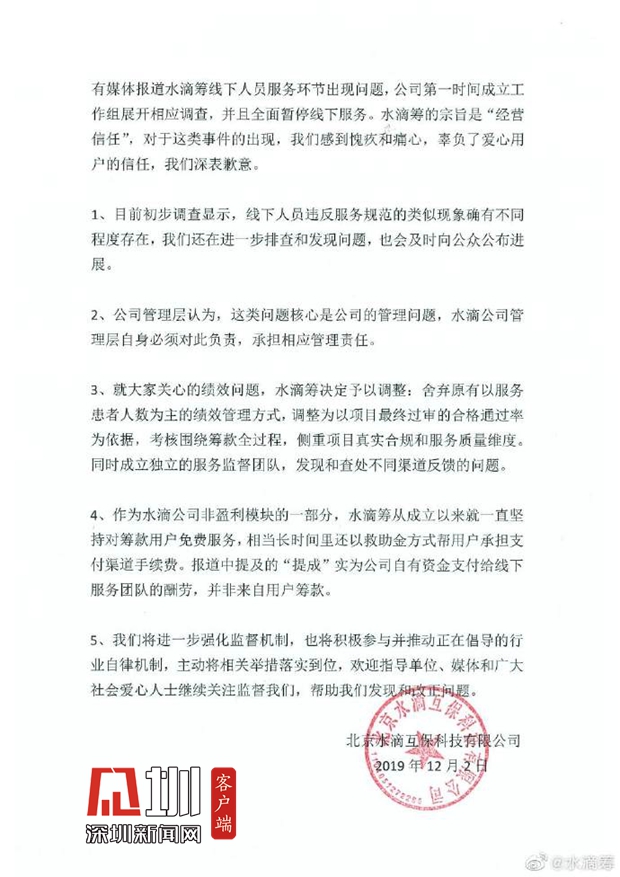 見(jiàn)圳客戶端.深圳新聞網(wǎng)2019年12月6日訊(見(jiàn)圳客戶端、深圳新聞網(wǎng)記者 張玲)2019年11月30日,據(jù)梨視頻報(bào)道,互聯(lián)網(wǎng)籌款平臺(tái)“水滴籌”在超過(guò)40個(gè)城市的醫(yī)院派駐地推人員,線下地推服務(wù)人員被指在醫(yī)院“掃樓”尋找求助者,套用模板,隨意填寫(xiě)金額,不審核甚至隱瞞求助者財(cái)產(chǎn)狀況,鼓勵(lì)患者大量轉(zhuǎn)發(fā)籌款信息。同日,水滴籌通過(guò)微博官方認(rèn)證公眾號(hào)回應(yīng)稱(chēng),已第一時(shí)間成立緊急工作小組開(kāi)展相關(guān)情況排查,同時(shí)線下服務(wù)團(tuán)隊(duì)全面暫停服務(wù),整頓徹查類(lèi)似違規(guī)行為,并對(duì)梨視頻報(bào)道可能引發(fā)的誤解進(jìn)行了3點(diǎn)說(shuō)明。