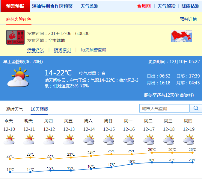 見圳客戶端·深圳新聞網(wǎng)2019年12月10日訊 今日深圳晴天間多云,空氣干燥;氣溫14-22℃;偏北風(fēng)2-3級(jí);相對(duì)濕度25%-70%。