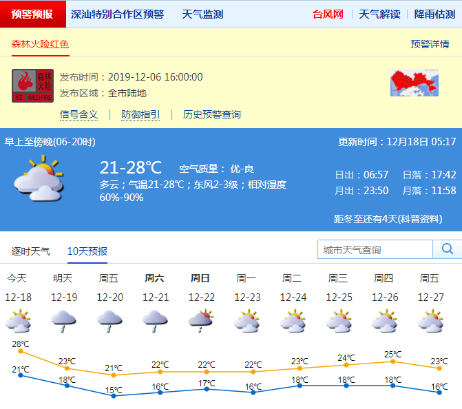 見圳客戶端·深圳新聞網(wǎng)2019年12月18日訊 深圳市氣象局預計18日多云,午間天氣溫暖,早晚有輕霧,氣溫21-28℃;19-22日受冷空氣影響,轉陰天,部分時間有分散小雨,氣溫下降,天氣轉涼,其中19日沿海、高地陣風5-6級;23日多云,可見陽光。森林火險紅色預警信號持續(xù)生效中,請注意森林防火。