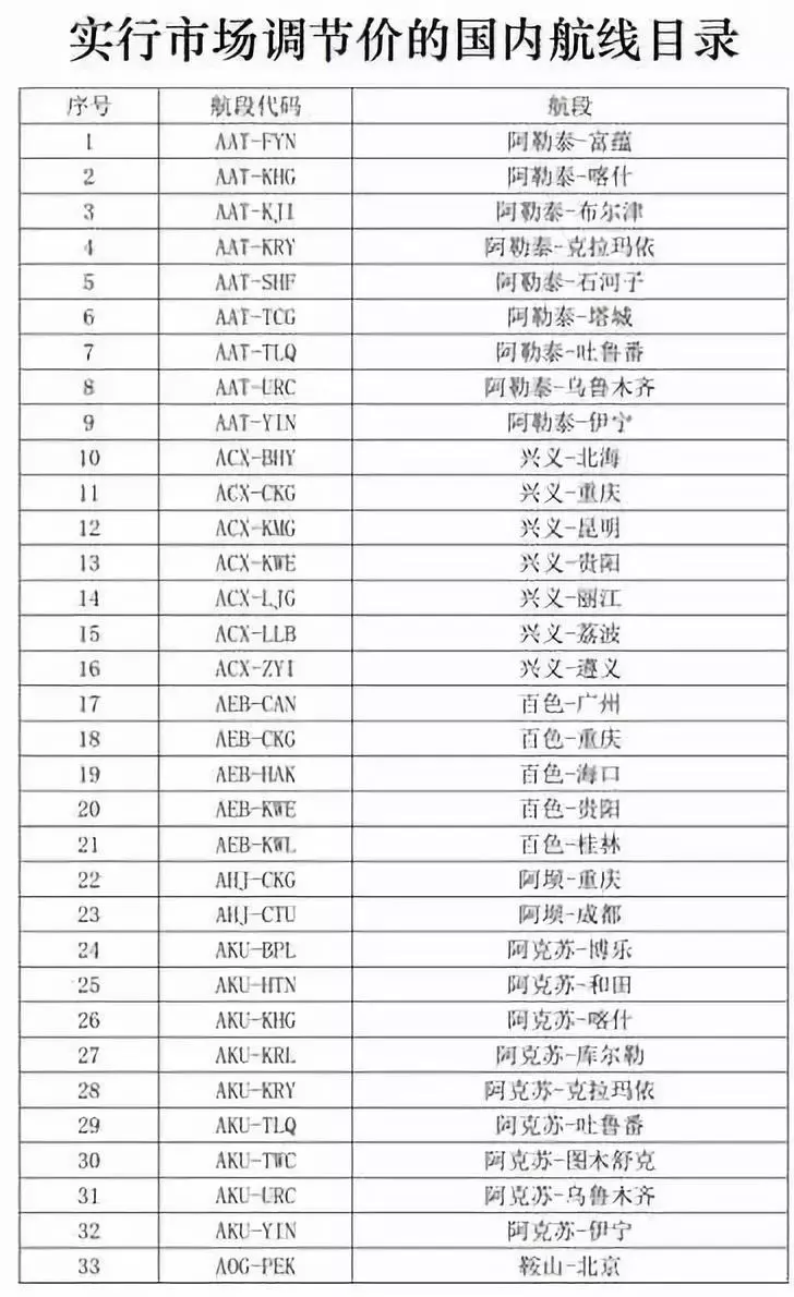 民航局最新《實(shí)行市場調(diào)節(jié)價(jià)的國內(nèi)航線目錄》部分截圖